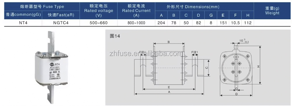 फ्यूजको यो श्रृंखला फ्यूज लिङ्क र फ्यूज आधार समावेश गर्दछ। फ्यूज आधारहरू उच्च शक्ति सिरेमिक फ्लोर वा उच्च तापमान राल फ्लोर, स्थिर सम्पर्कको वेज आकारको संयोजनबाट बनेको हुन्छ। यो खुला संरचना हो र राम्रो गर्मी अपव्यय, उच्च मेकानिकल बल, भरपर्दो पहुँच र सञ्चालन गर्न सजिलो छ। यस शृङ्खलासँग मिल्दोजुल्दो, आधारबाट फ्यूज तान्न NH फ्यूज पुलर प्रयोग गरिन्छ। शुद्ध तामा वा चाँदीको टुक्रा (वा चाँदीको तार) द्वारा बनाइएको फ्यूज बडी फ्यूजन ट्यूबमा बन्द गरिएको छ जुन उच्च शक्ति पोर्सिलेनद्वारा बनाइन्छ। त्यहाँ उच्च-शुद्धता क्वार्ट्ज बालुवाले भरिएको हुन्छ रसायन विज्ञान पछि प्रशोधन गर्नका लागि ट्युबमा फ्यूजको प्रयोग गर्न सकिन्छ। वा स्ट्राइकर, जब फ्यूज तत्व फ्यूज हुन्छ यसले फ्युजिङ प्रदर्शन गर्न सक्छ वा प्रत्येक प्रकारको संकेतलाई रूपान्तरण गर्दछ साथै स्वचालित स्थानान्तरण सर्किट (स्ट्राइकर)